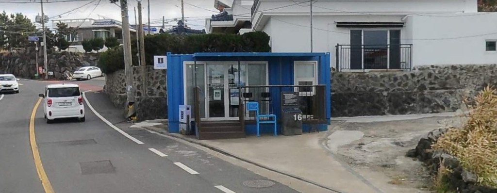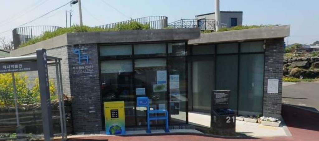 The first thing walkers need to note about this Info Center – it is not at the route start point. You need to begin the route and walk at least 10 minutes. Then you will find the center. Also, there are toilet facilities. These are very useful if you have just come off a long bus ride from Jeju City or Seogwipo City. The red circle is the start point. The red square is the information center.