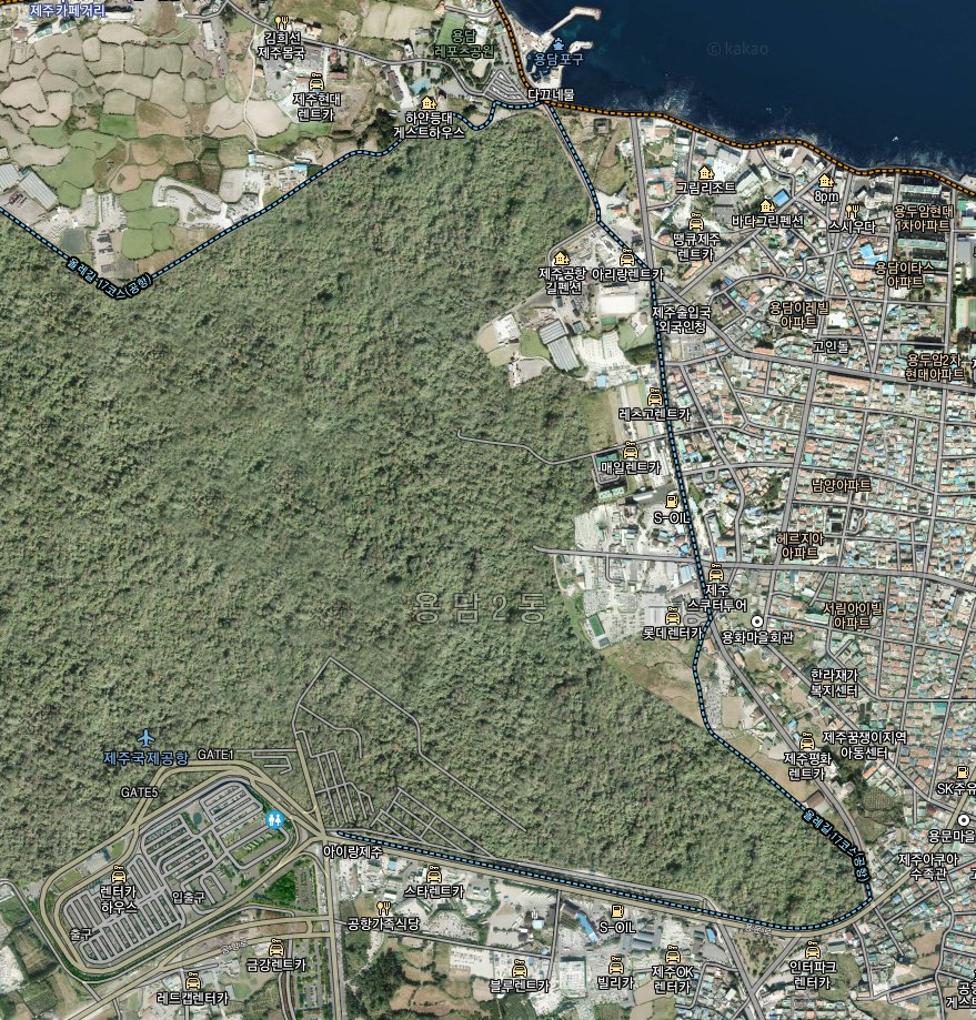 It is possible to step off the plane, out of the airport, and on to Jeju Olle Trail. The route is way-marked as normal. When you meet the orange line at the ocean turn right to continue into the city. It should take an hour or two to reach the Ganse Lounge (end of Route 17 / start of Route 18) where you can get your Olle stuff and have a meal at a reasonable price. Also, we recommend downloading Kakao or Naver map application.