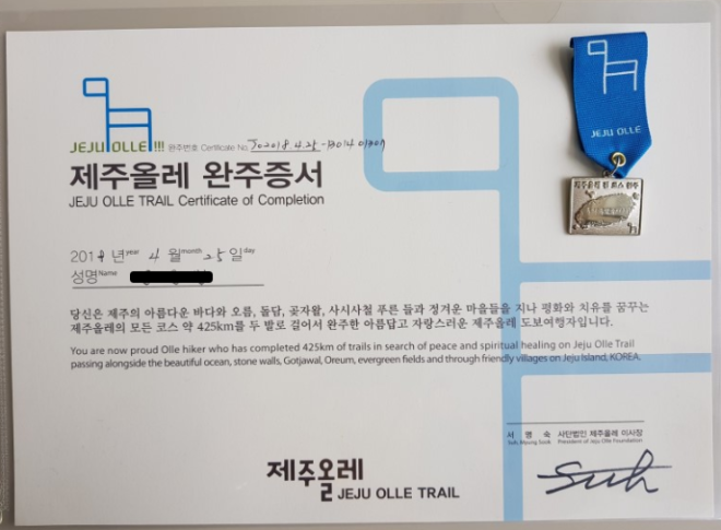 A walker will need all stamps from all routes in their paper Olle passport (20,000 KRW) or smartphone app Olle passport (free download, Korean-language only, Korean phone number needed to access some services, in-app passport purchase option 20,000 KRW) for the 437 km completion certificate and mini-medal (extra 5,000 KRW). More recently a 100 km completion certificate has become available too. We also have a joint completion certificate system with the Camino in Spain.